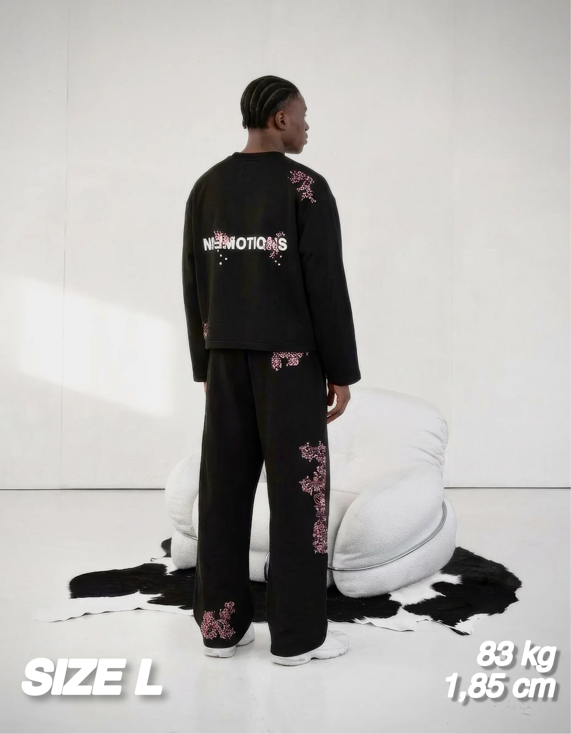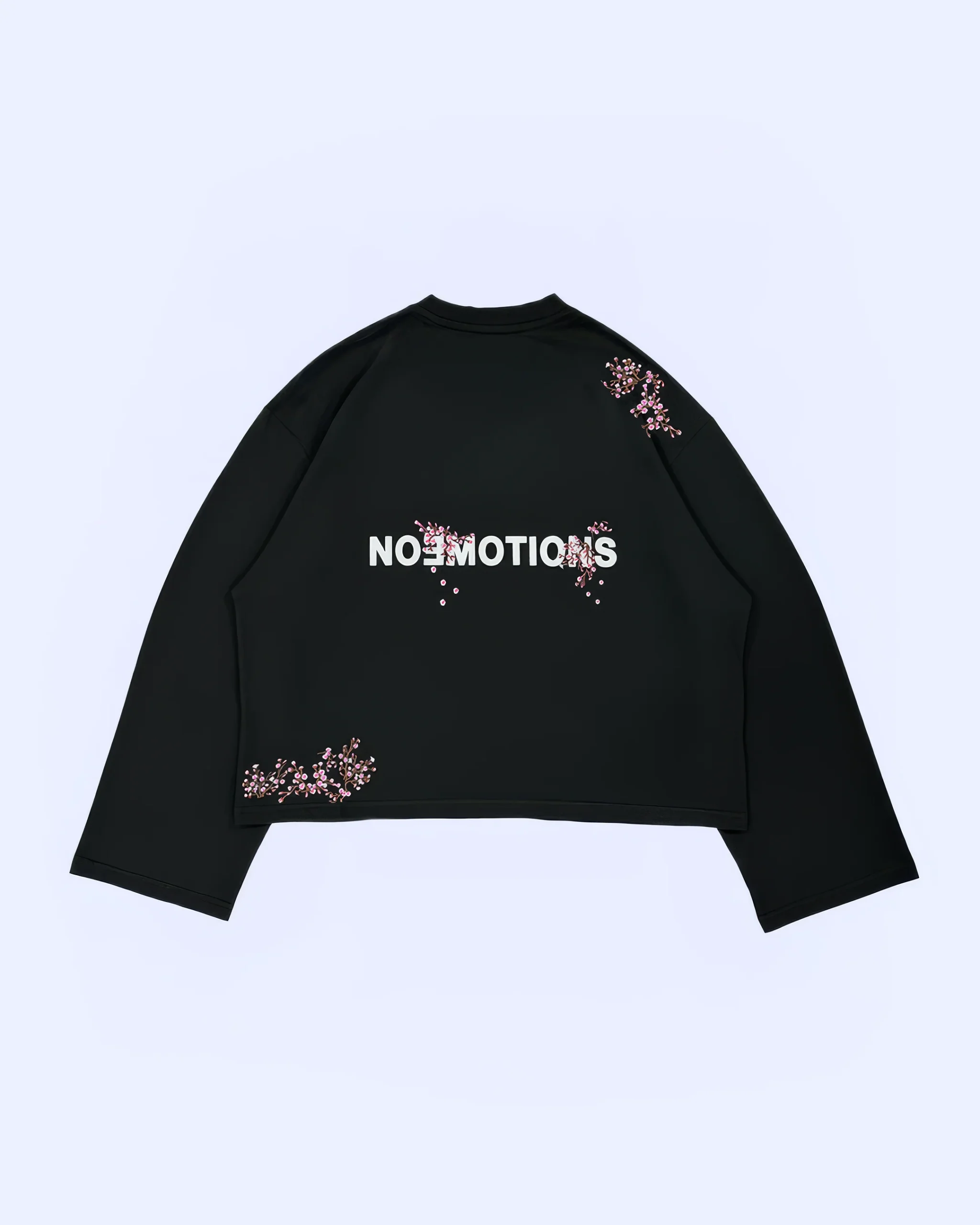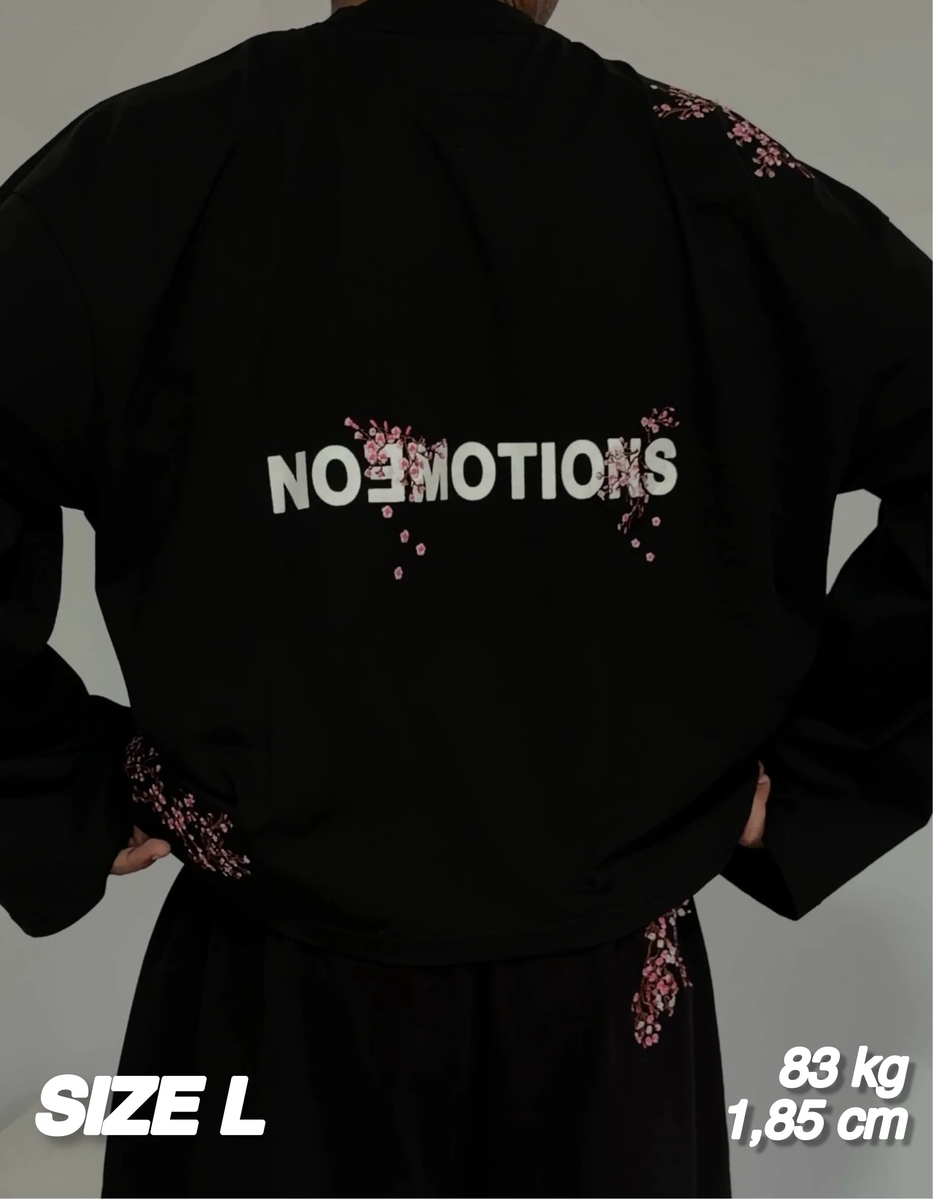 Delicate blossom graphics appear across the sleeves and body, adding soft contrast to the deep black base. A subtle Noemotions logo embroidery on the chest keeps the design clean while reinforcing the brand’s identity.