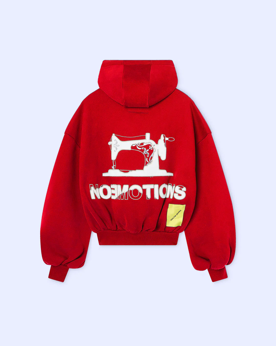 The front showcases minimal logo embroidery, keeping the look refined and balanced. Contrast stitching on the kangaroo pocket adds subtle texture and depth. On the back, a bold 3D appliqué graphic of a vintage sewing machine pairs with the iconic “Noemotions” lettering, creating a handcrafted, ironic aesthetic that reflects the brand’s creative roots.